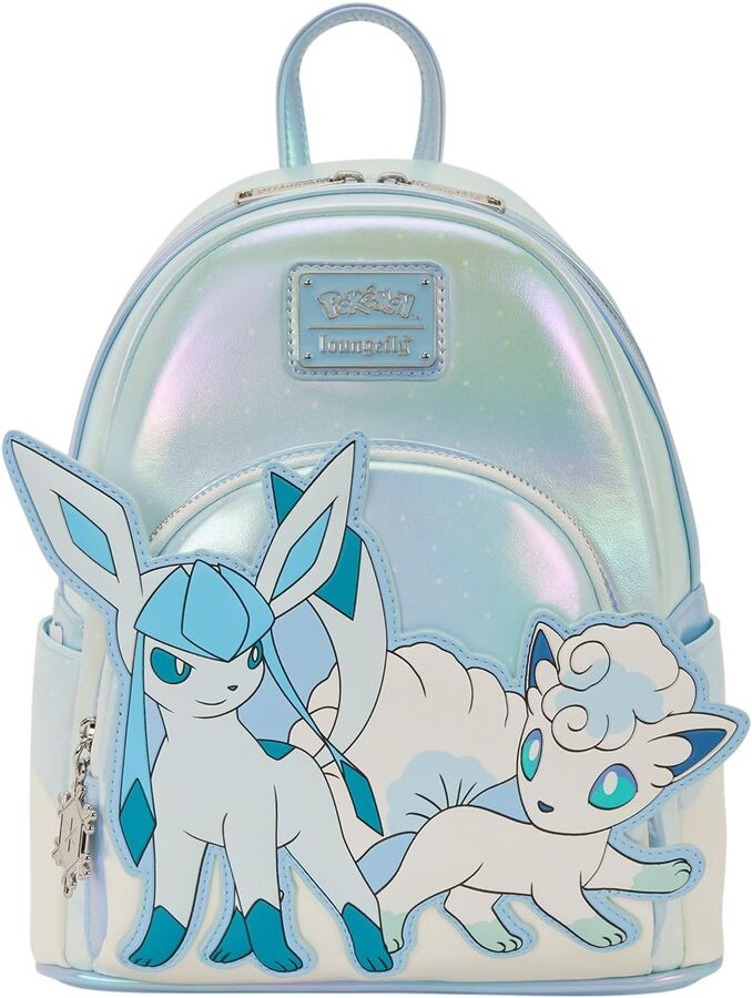 This mini backpack is for you! This bag is light blue and white, featuring a snowy scene at the background. On the front pocket, you'll find appliques of Glaceon and an Alolan Vulpix! Snowflakes add fun details as the zipper pull and appliques on the straps!