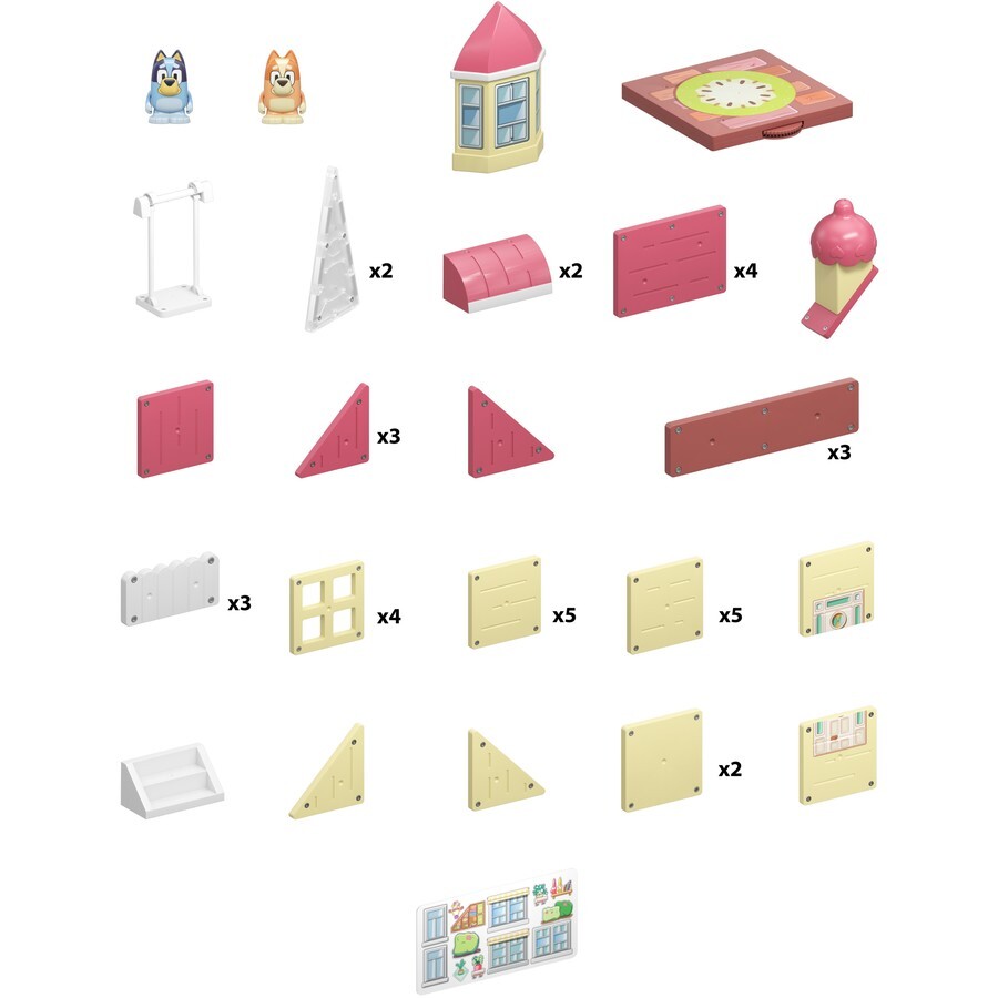 - The Tile Town Bluey Heeler Home Construction Set has a variety of 46 Magnetic pieces and accessories to give your child an enriched & elevated building experience.
