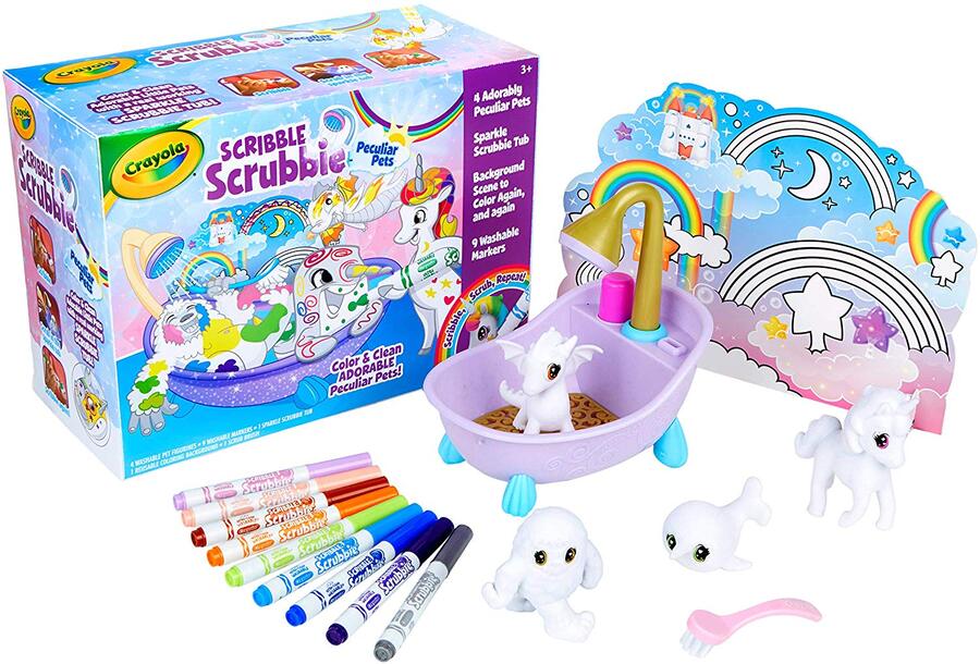 - PET CARE TOY: Includes 4 Peculiar pets, 1 sparkly scrub tub, 1 scrub brush, 9 washable markers, 1 standing play mat, and an instruction sheet!