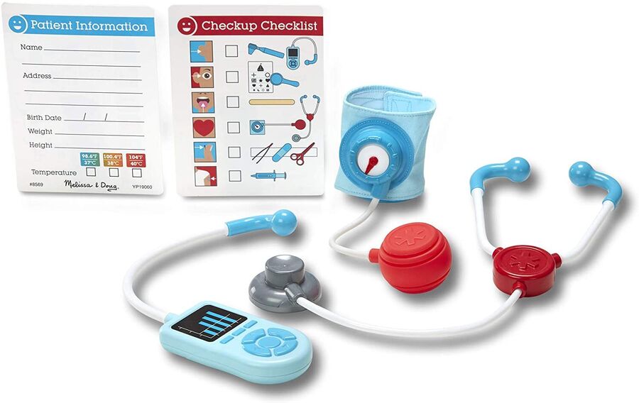 Set includes play stethoscope, blood pressure cuff, hearing tester, syringe, scissors, tweezers, rolling forehead thermometer, reflex hammer, otoscope, eye cover, tongue depressors bottles, ID badge, activity cards, and more.