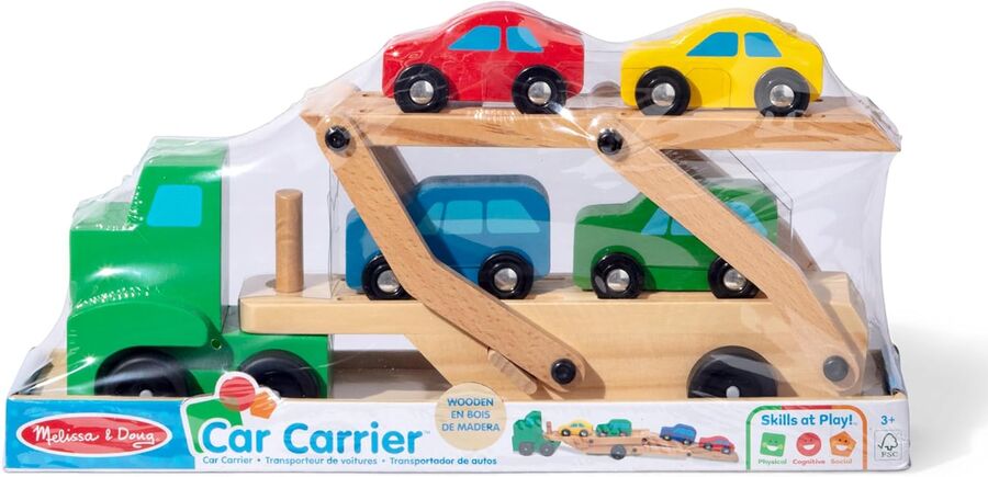This wooden Car Carrier has a big job to do: delivering four colorful cars to their new homes! The Melissa & Doug wooden truck features an easy-fold ramp with an upper and lower level. Kids can extend the lower level, and drive their cars up onto the ramp, then lift it up to hold two of the cars when it's time to roll out. Kids can sort and sequence the wooden cars by color to inspire playful counting, and sequencing activities. Car- and truck-loving kids will love discovering endless play possibilities as they roll this wooden truck toy all around the house and to the ends of their imaginations. The tough vehicles have sturdy wooden chassis and smooth-rolling wheels, so they'll stand up to countless deliveries and road trips. And maneuvering the ramp is easy to do, great for fine motor skills and hand-eye coordination, and so much fun! Designed to engage playful preschoolers and young children, and constructed with care to withstand their harshest treatment, this play set is made of durable, child-safe materials and is safety-tested to our most rigorous standards. It makes a great gift for preschoolers and kids ages three and older for hands-on, screen-free play.