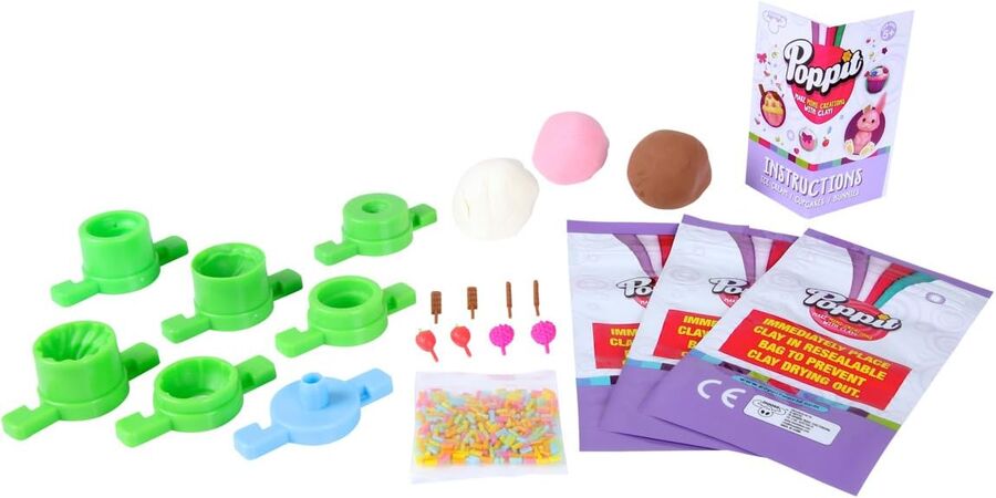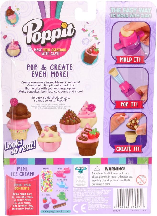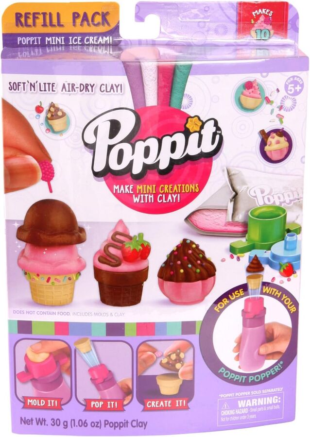 - The Poppit Refill pack comes with three different colored clays and seven different Poppit molds. With lots of pieces to decorate and sprinkles as well, you are ready to create some mini magic!