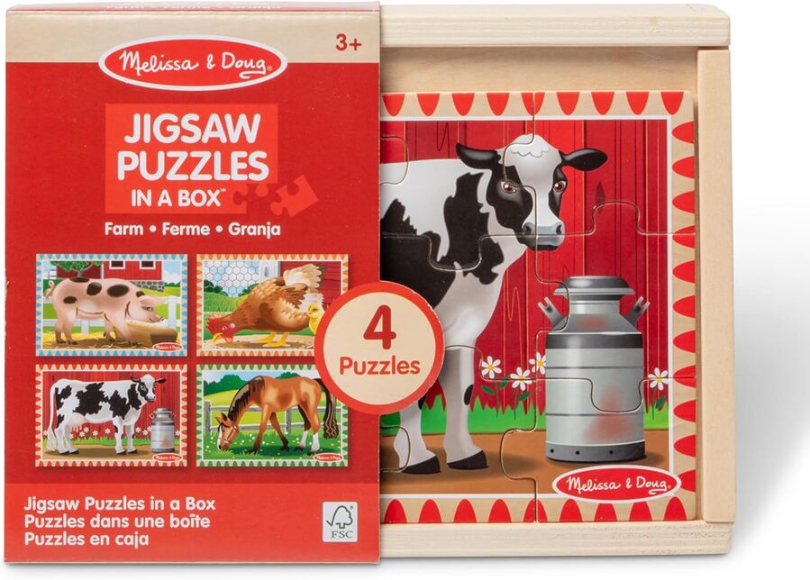 Set includes four wooden, 12-piece farm animal jigsaw puzzles-a hen and her chick, cow, a pig, and a horse-- each stored in a separate compartment of a sturdy wooden box! The slide-on box lid doubles as a convenient puzzle board! Each puzzle piece is shape-coded on the back for easy sorting. Great for travel!