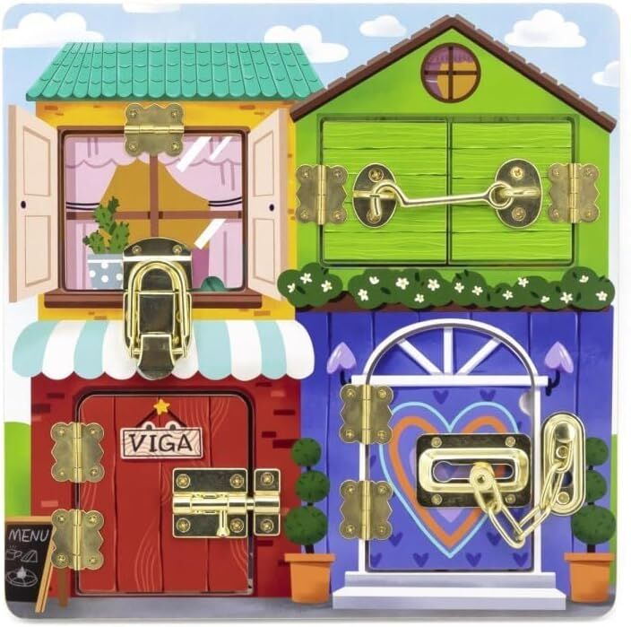4 doors, each with a different latch or lock mechanism, open up to discovery of different locking mechanisms that are practical for little ones to know. Behind each door is an adorable animal illustration surprise that will surely put a smile on kids' faces.