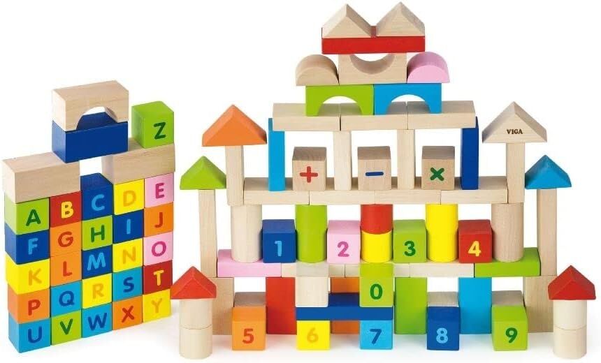 - 100 quality, smooth Viga Toys Wooden Building Blocks, in a variety of sizes and colours can boost your child’s creativity and dexterity as they learn to build from their imagination. These sturdy coloured blocks include a range of alphabet, numerical blocks and mathematical symbols. Great for learning colours, shapes, alphabet and numercy as well as fine and gross motor skills and imaginative play. Our building blocks will make the perfect addition to any child’s play room. Blocks are painted with non toxic paint. Building blocks promotes co ordinations and problem solving skills. Packing up is a breeze, the tub can be used as storage.