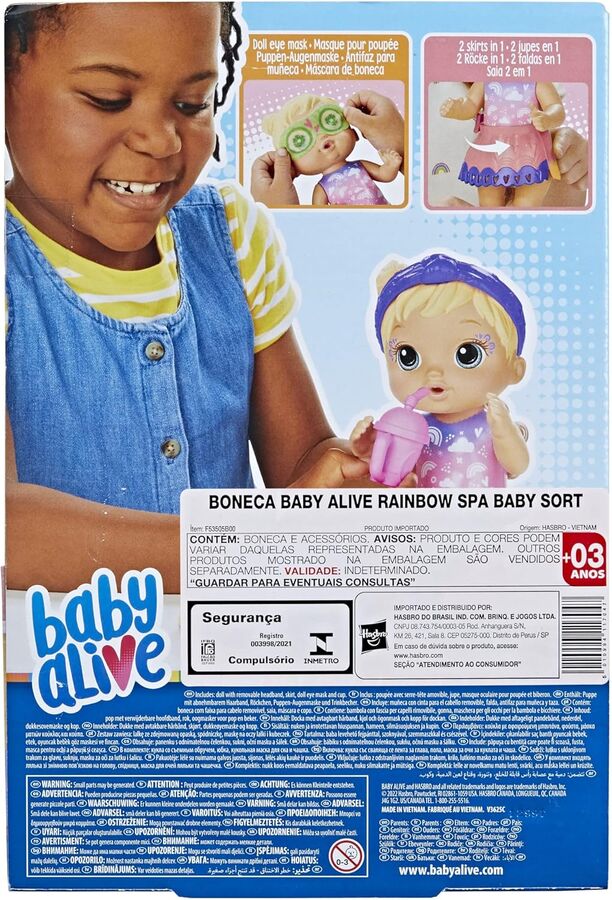 It’s a make-believe spa day for Baby Alive Rainbow Spa Baby doll! This 9-inch Baby Alive doll comes with a cute cucumber-inspired doll eye mask. It’s a fun spa-themed toy for girls and boys featuring a vibrant dual-sided skirt kids can twist and create a different look. Rainbow Spa Baby doll for kids ages 3 and up also includes a matching headband and a play bottle so kids can pretend to feed her. With 5 points of articulation, this poseable doll makes a fantastic present for birthdays and holidays. Baby Alive and all related properties are trademarks of Hasbro.