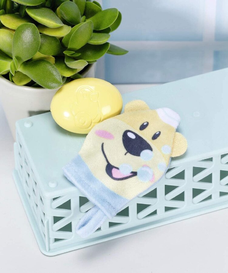 Bruno the Bear is the captain of the bathtub and splashes around on the pink towel. The fine white lines look like little waves. Before wrapping herself in the towel and putting on the hood, Baby Born washes herself thoroughly with the bear flannel and the yellow soap.