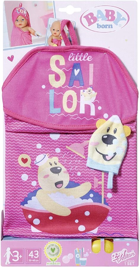 - Baby Born Bath Hooded Towel Set with towel, flannel and toy soap.
