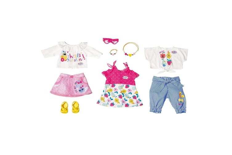 Dressing up is one of life's greatest forms of self-expression. Let your child show their personality by allowing them to mix and match the different pieces from the Baby Born Deluxe Fashion Set Spring. This outfit set comes with 3 sets of clothing with some accessories designed for Baby Born 43cm dolls including a bracelet, a necklace, a pair of sunnies, a pretty dress, a long-sleeved blouse, a t-shirt, a pair of striped pants, a skirt and a pair of yellow sandals that will go so well with any outfit your child decides to create!