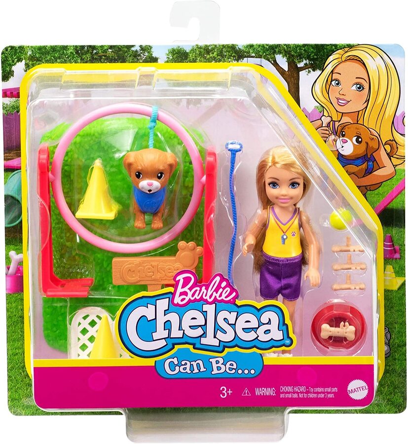 - Kids can explore a world of fun with the Barbie® Chelsea® Can Be dog trainer playset!