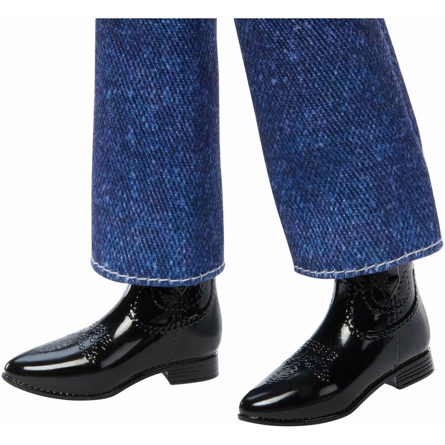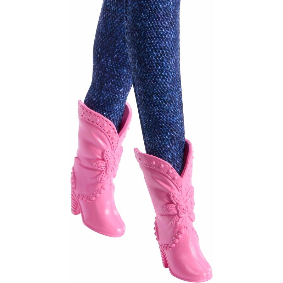 - Barbie doll has her hair swept into a totally retro side pony! She pairs her pink monogrammed Barbie top with blue jeans, a ribbon belt, and pink cowboy boots.