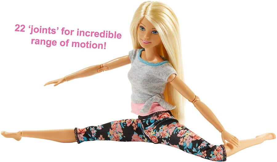- Barbie is always on the move, and Barbie Made to Move dolls can move in so many ways! Play out lifelike movement with the ability to maneuver and pose in positions that mimic realistic action. Each doll has 22 "joints" -- in the neck, upper arms, elbows, wrists, torso, hips, upper legs, knees AND ankles -- for lots of flexibility and an incredible range of motion. Whatever action a story requires -- riding a bicycle, performing onstage, doing gymnastic bends, sitting cross-legged -- Barbie doll's flexible moves, guided by you, can do it all! Casually chic outfits encourage endless storytelling and highlight the dolls' dynamic posability. Capture realistic poses for action shots, fashion shoots, doll selfies -- there's so much more room for creative self-expression by kids with so much more movement by Barbie doll. Barbie Made to Move dolls inspire active play, creativity and role-play fun! Includes Barbie Made to Move doll wearing yoga clothes. Each sold separately, subject to availability. Dolls cannot stand alone. Colors and decorations may vary.