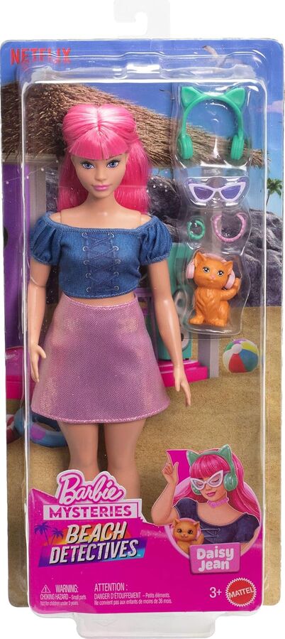 - Imaginations can dream up all kinds of detective stories with Daisy doll inspired by the series Barbie Mysteries: Beach Detectives! This fashion doll brings the character to life wearing her signature shimmery-pink skirt, blue top and pink boots. Her look is complete with fun fashion accessories just like the ones she wears onscreen! The storytelling fun continues with a pet kitten wearing adorable headphones of her own. Kids and fans ages 3 years and older will love recreating scenes and making up their own mysteries with Daisy doll! Doll cannot stand alone. Colors and decorations may vary.