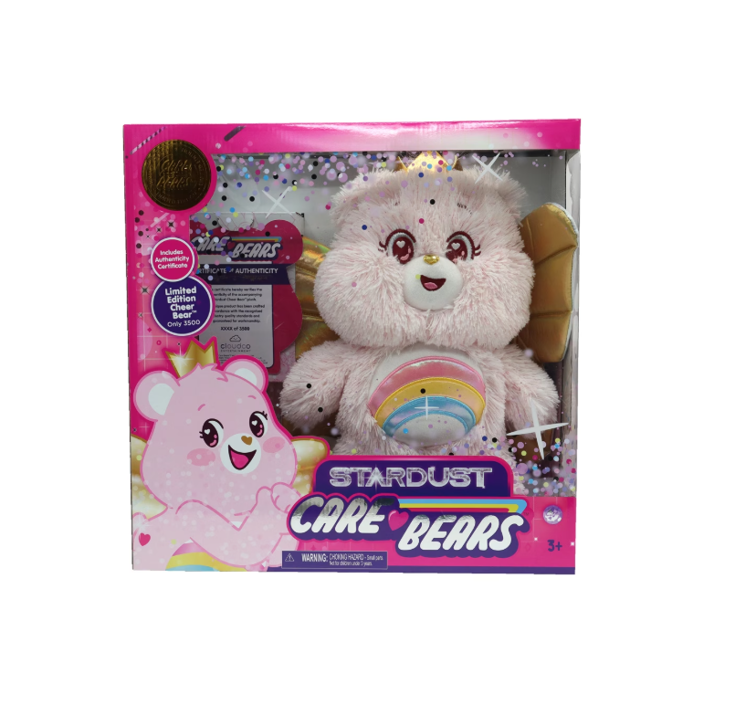 Cheer Bear shines like never before in the Stardust Collection—a limited edition plush made for collectors and dreamers alike. With shimmering gold iridescent wings, a sparkling crown, and a soft crystal nose, this plush is pure stardust magic. Packaged in a premium collector box with metallic detailing and a numbered certificate of authenticity, it's a star-worthy addition to any Care Bears collection.