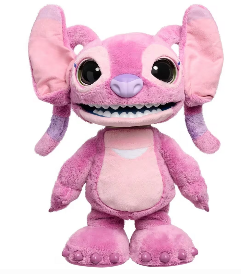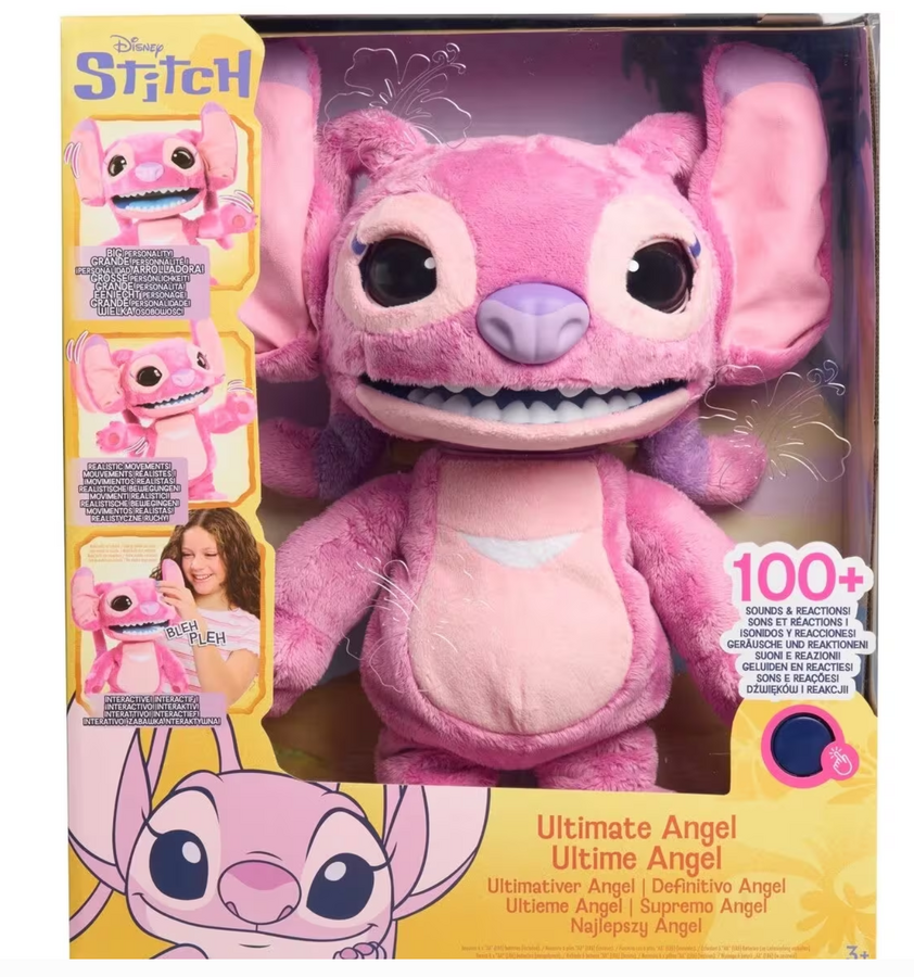 - Discover the hilarious and realistic extremes of an out-of-this-world personality with the Disney Ultimate Angel Interactive Feature Plush toy. With over 100 sound and motion combinations, kids and fans will experience a full range of all the feels – from playful sweetness to a full-on alien tantrum. This fluffy, 43cm interactive plushie is full of surprises. Tap or press Disney Angel’s nose, tongue, belly or hand for hilarious antics and sayings in her native Tantalog language. She sneezes, giggles, munches, blows kisses, dances and sings. Touch and hold Angel’s nose or belly for two seconds to activate feelings of affection. It’s Angel at her sweetest and silliest. She purrs, sighs and says adorable phrases. Tap Angel’s nose or belly twice, then get ready for a tantrum - Angel snarls, snorts, chomps and spouts feisty alien gibberish. Hold her hand to soothe her. In a few seconds, she returns to happy laughs. This remarkably lifelike interactive toy is sure to the be the centrepiece of any Disney collection of stuffed animals and Stitch plushies. She’ll be next-level entertainment at parties, family movie nights, picnics, video chats and any occasion that needs a little alien appeal. The Disney Ultimate Angel interactive plush toy makes an excellent holiday gift, birthday present or anytime surprise for fans of Disney toys, collectors and kids aged 3 years and up.