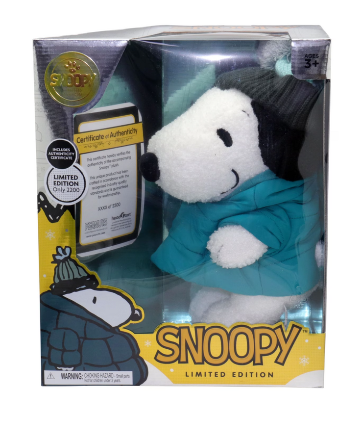 Stay warm in style with this Limited Edition Snoopy Plush! Snoopy’s all bundled up in his classic puffer jacket and cosy beanie — ready for winter adventures.