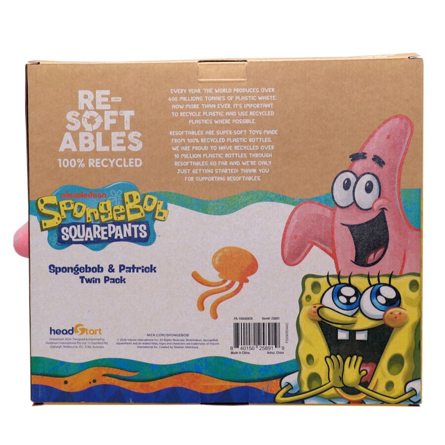 - With this Resoftables SpongeBob SquarePants & Patrick Twin Pack, you're getting not just one, but two adorable plushes made to spread joy and protect the planet!