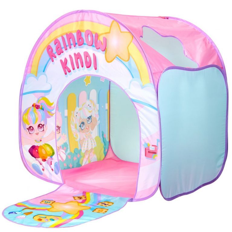 Pop up. Peep out. Play. Join Marsha Mello, Donatina and Rainbow Kate for a day of play in this fun packed pop up Rainbow Kindi Play Tent. Fold down the door and create some games on the printed play mat or peep out of the star window in the roof for some peek a boo giggles. Little girls will love this colourful pop up play tent. Ideal for adventures inside and out, this Kindi Kids play tent for kids is packed with fun features, including a fold down door play mat and peep through star window in the roof.