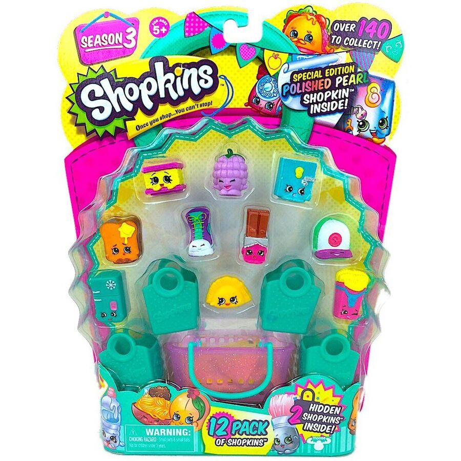 - Includes 12 Shopkins, 1 shopping basket, 4 shopping bags and a collector's guide