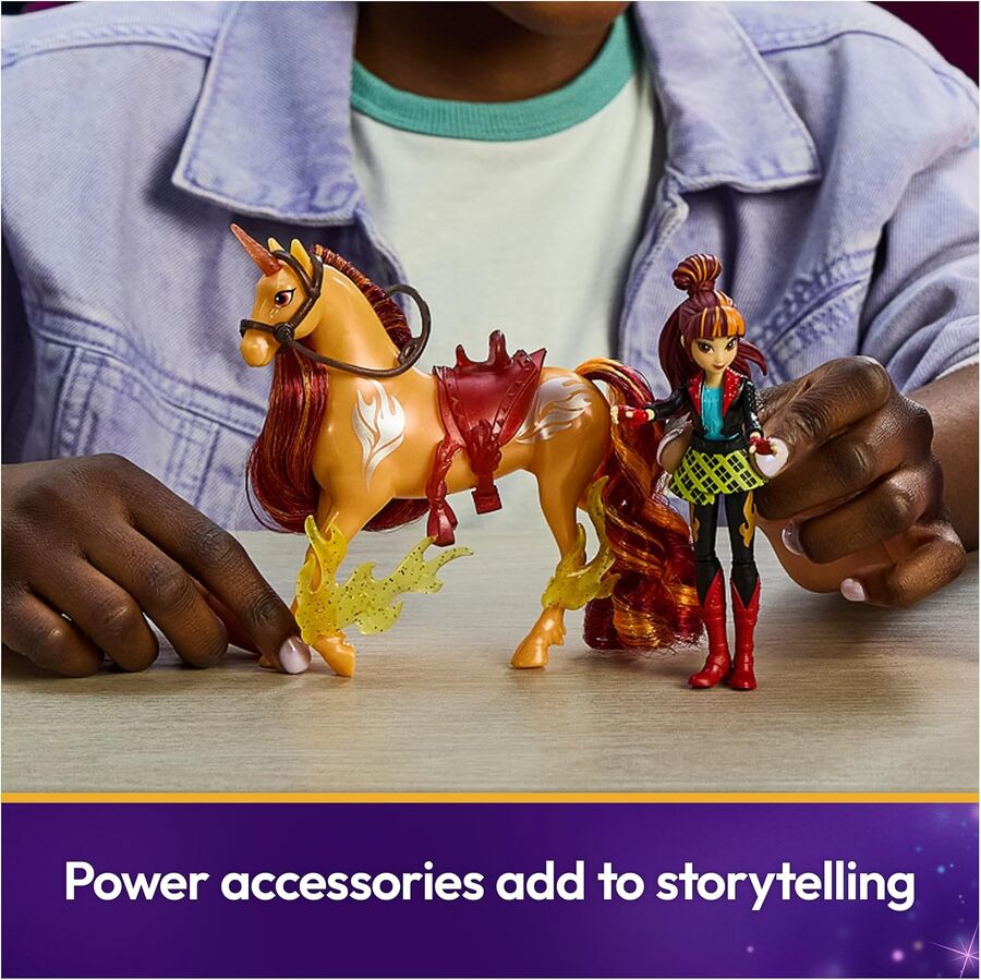 - Cinder 5” unicorn toy & doll accessories: Cinder’s details include metallic Fire Magic markings, 2 translucent clip-on power accessories, a brush, plus a translucent removable saddle & bridle for added play.