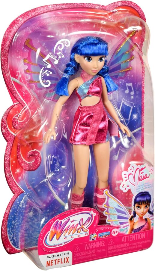 This beautifully detailed fashion doll features Musa in a glittery pink asymmetrical outfit with shimmering accents and coordinating boots that capture her bold stage-ready style. Her long blue hair with bangs adds to her signature look and is perfect for imaginative styling fun. Complete with removable translucent wings dusted in glitter, Musa is ready to soar into magical adventures filled with friendship, fashion, and fun. Collect all your favorite Winx Club fairies and let the magic begin.