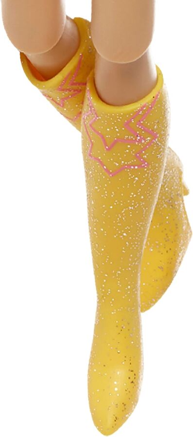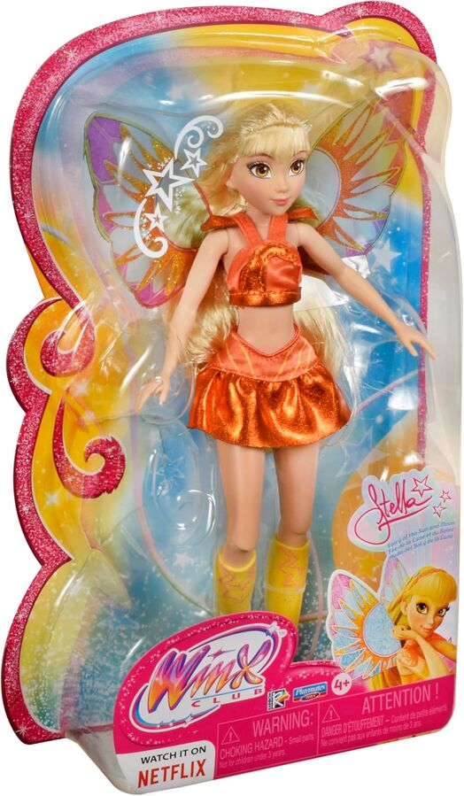 This bold and beautiful doll features Stella in a vibrant orange two-piece outfit with a shimmering skirt and sun-inspired details. Her golden yellow boots, glittery wings, and long flowing blonde hair complete her sunny, confident look, perfect for brightening any fairy collection.
