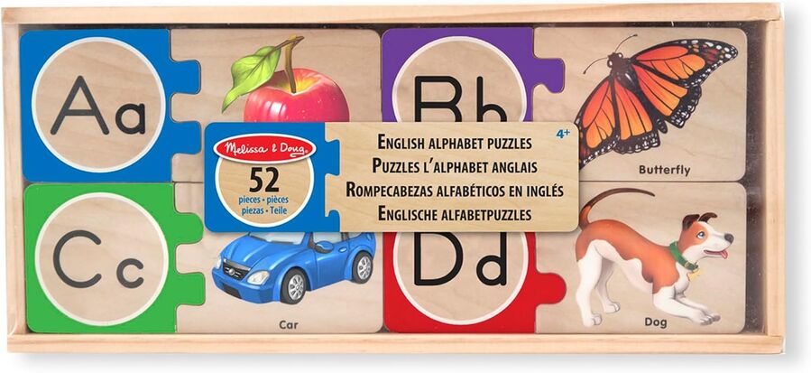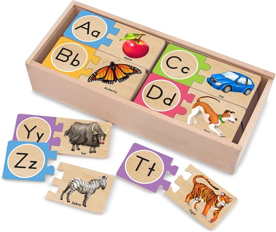 - EDUCATIONAL ALPHABET LETTER PUZZLE: The Melissa & Doug Self-Correcting Alphabet Letter Puzzle set includes 52 durable wooden pieces that help kids learn the ABCs as they match letters to pictures.