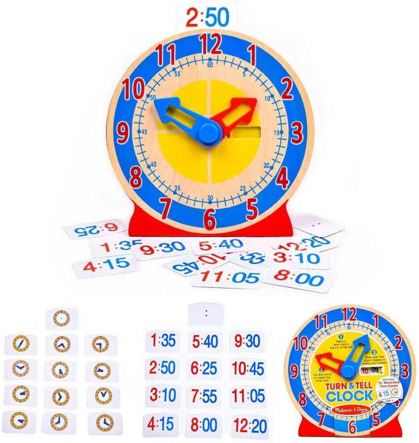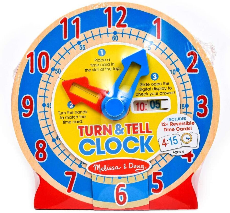 Educational Details: The clock face has large red numbers to match the hour hand, small blue numbers to match the minute hand, and a segmented color disk to help kids visualize "quarter past" and "half past" Helps Develop Multiple Skills: This learning clock promotes hand-eye coordination and concepts of time. It encourages abstract thinking, explorative play, and independent learning Great Gift for Ages 4 to 7: The Melissa & Doug Turn & Tell Wooden Clock is an ideal gift for kids ages 4 to 7; add a Melissa & Doug See & Spell Learning Toy to round out the hands-on, screen-free play experience “The Gold Standard in Childhood Play”: For more than 30 years, Melissa & Doug has created beautifully designed imagination- and creativity-sparking products that NBC News called “the gold standard in early childhood play.” 100% Happiness Guarantee: We design every toy to the highest quality standards, and to nurture minds and hearts. If your child is not inspired, give us a call and we’ll make it right. Our phone number is on every product!
