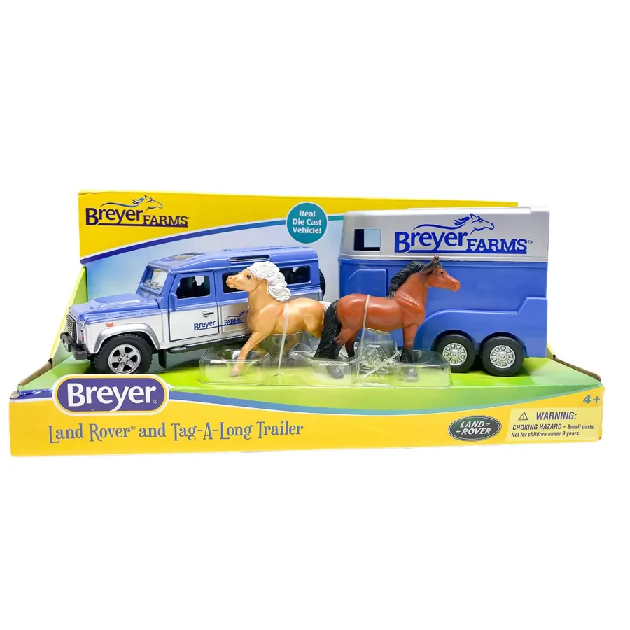 The Land Rover and Tag-A-Long Trailer features die-cast metal vehicle with working doors and rolling wheels. You'll travel in style with the two-horse trailer featuring a drop-down loading ramp. Comes with 2 ponies: a bay and a palomino!