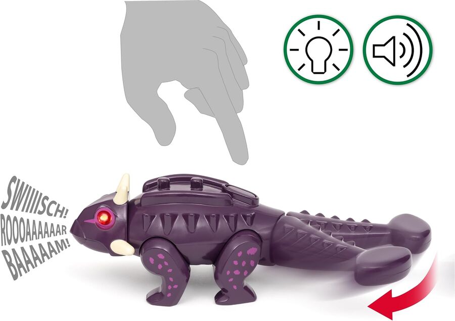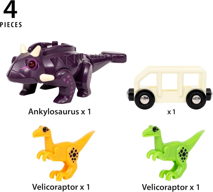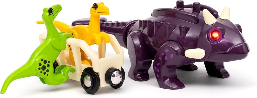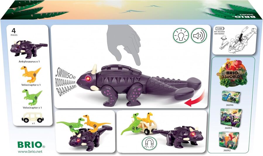 - Smash through any obstacle with the 36082 Dinosaur Attack Set. Designed to fit perfectly over BRIO wooden tracks, this mighty dino comes alive with red light-up eyes and motion-activated roaring. With its spring-loaded tail ready to swing, your child can use the Ankylosaur to knock away the two colourful velociraptor figures included in this playset. A magnet hidden in its tail lets you pull wagons, just like a BRIO train. Part of the BRIO World Dinosaur range, it's a must-have for kids who love dinosaurs and trains.