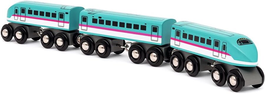 - This wooden high-speed train features two engines and one passenger carriage in vibrant colours, each rocking eight wheels across double bogies.