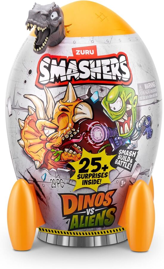 Blast off into an epic adventure with Smashers Dino VS Aliens! SMASH your way through a rocket ship to uncover dino parts hidden within layers of slime and sand. As you piece together the mighty dinosaur, get ready to meet the two mischievous alien characters and their fearsome UFO, each equipped with unique weapons. Prepare for an intergalactic showdown as your custom-built dino takes on the alien invaders in an action-packed battle. Unleash your imagination and determine who will triumph in this cosmic clash! With over 20 surprises inside and three dinos to collect, this is the ultimate addition to your Smashers collection.