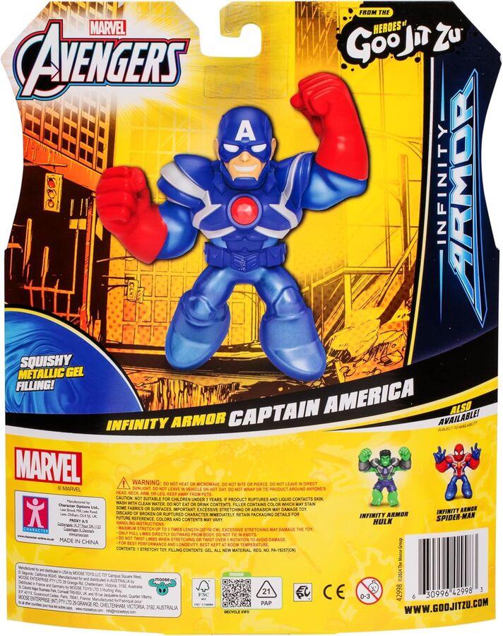Each Marvel Infinity Armor Super Hero has a unique goo filling that has a different texture and feel. Collect all 4.5" / 11.4 CM Marvel Super Heroes including Infinity Armor Spider-Man, Infinity Armor Hulk and Infinity Armor Captain America! Play with your favorite Marvel Super Heroes in an awesome GOOEY way and with NO mess! Kids will love to squeeze, squish and stretch their arms, legs and bodies of these incredible toys! Their amazing stretchy bodies can stretch out and then return to their original shape! Collect them all!