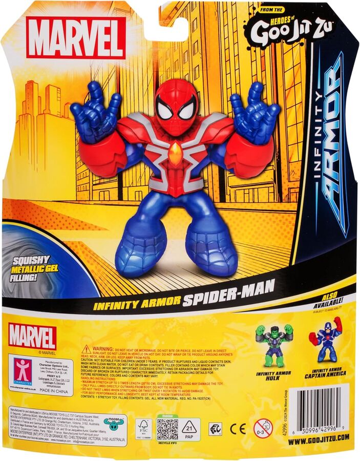 Each Marvel Infinity Armor Super Hero has a unique goo filling that has a different texture and feel. Collect all 4.5" / 11.4 CM Marvel Super Heroes including Infinity Armor Spider-Man, Infinity Armor Hulk and Infinity Armor Captain America! Play with your favorite Marvel Super Heroes in an awesome GOOEY way and with NO mess! Kids will love to squeeze, squish and stretch their arms, legs and bodies of these incredible toys! Their amazing stretchy bodies can stretch out and then return to their original shape! Collect them all!
