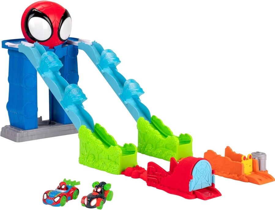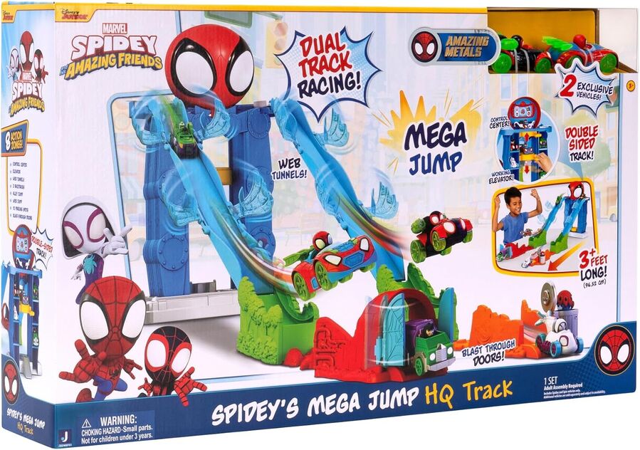 This double sided track has ten parking spots for extra vehicle storage. The Spidey’s Mega Jump HQ Track is inspired by the hit show Spidey and His Amazing Friends. Officially licensed MARVEL product from Jazwares.Mega jump HQ track: Leap into adventure with the Marvel Spidey’s Mega Jump HQ Track Dual track playset: 39-inch dual race track features elevator, control centre, web tunnels and ramps ight action zones: Features eight unique play zones and two 5-inch mega jumps onto the exit ramps Exclusive vehicles and storage: Two exclusive 3-inch Amazing Metals vehicles and ten parking spots