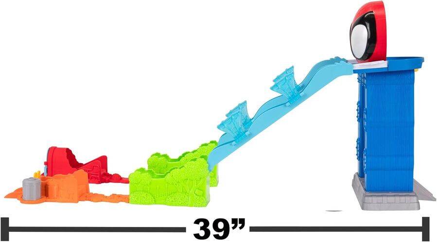 Leap into adventure with the MARVEL Spidey and His Amazing Friends Spidey’s Mega Jump HQ Track. This deluxe 39-inch dual race track showcases the Spidey team’s Web-Quarters, featuring an elevator, control center, web tunnels and two unique exit ramps.