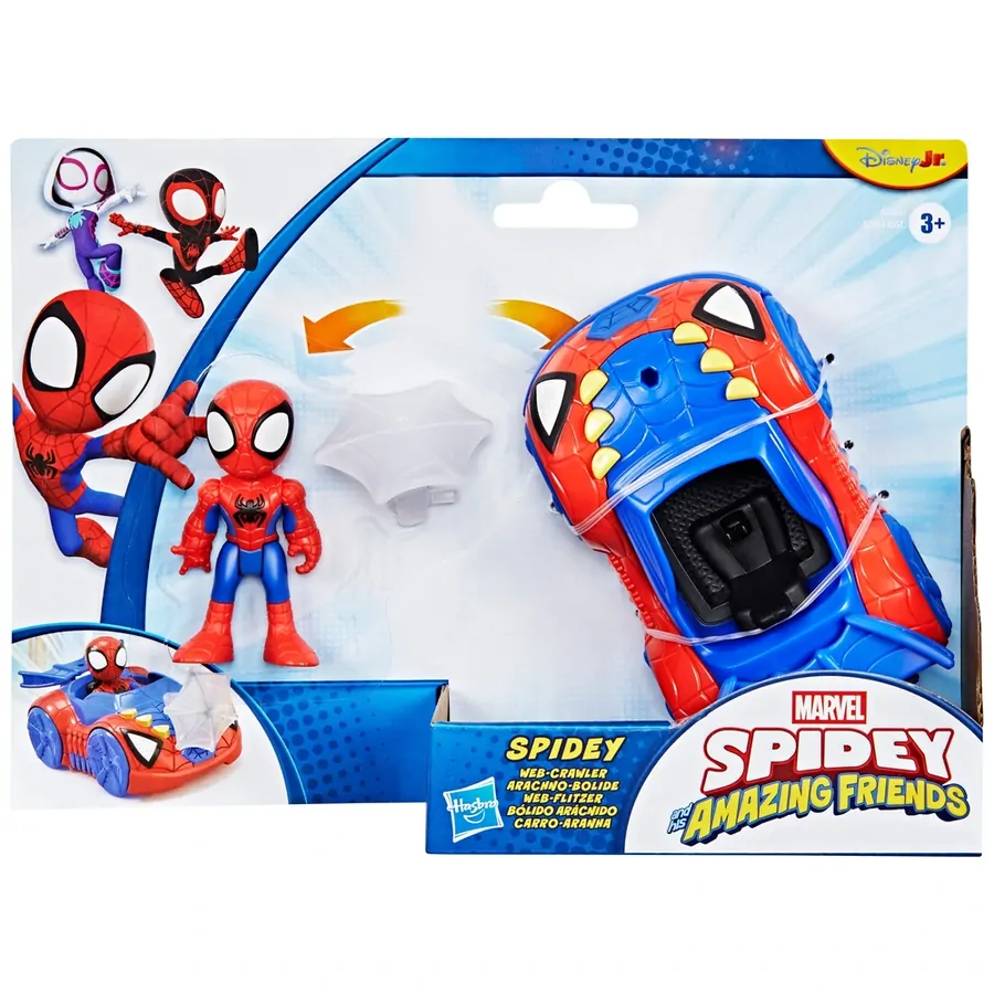 Race in to save the day alongside Team Spidey with this Marvel Spidey and His Amazing Friends Web Crawler action figure and car set! This awesome toy vehicle comes with a poseable 3-inch (7.6 cm) Spidey toy that fits inside, so kids can imagine speeding into action and adventure. For even more fun, attach the included character-inspired web accessory to either the Web Crawler or the Spidey figure and imagine web-blasting excitement! Encourage big, imaginative, adventure play for kids ages 3 & up with these Marvel toys for boys and girls, featuring design inspired by the Disney Jr. series Spidey and His Amazing Friends! Look for even more Spidey and His Amazing Friends toys, including Miles “Spin” Morales with Techno-Racer race car toy and Ghost-Spider with Copter, as well as playsets and accessories, to build a Super Hero web-slinger collection or give as cool Marvel gifts for preschool kids! (Each sold separately. Subject to availability.) Copyright MARVEL. All trademarks and registered trademarks are the property of their respective owners. HASBRO and all related trademarks and logos are trademarks of Hasbro, Inc.