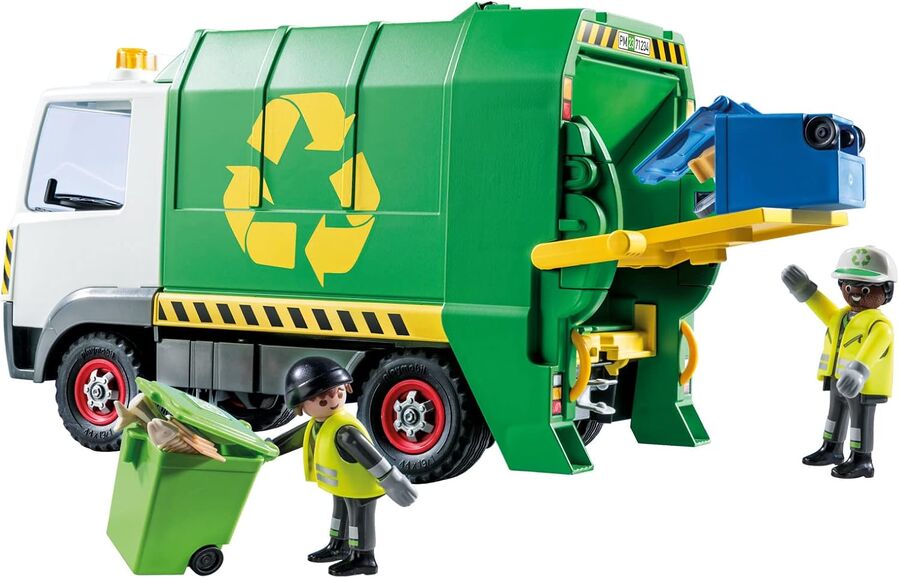 Help keep the city clean with the PLAYMOBIL Recycling Truck. This PLAYMOBIL City Life Recycling Truck comes with many realistic features, such as two bins and lots of garbage to collect and recycle. Help the sanitation workers to load the bins on the back of the truck and then pull the lever to lift and empty each container. To empty the vehicle, the entire container is tilted up and the rear attachment is lifted. Easily access the driver's cab thanks to the removable roof. Two members of the sanitation department can ride in the vehicle. Just like the real thing: The figures can stand on the left and right at the rear of the vehicle, holding on to the grab handle while driving. Includes 2 PLAYMOBIL figures. Dimensions: 10.6 x 4.7 x 6.4 in (LxWxH) Recommended for ages four to ten years. Warning. Choking Hazard. Small parts. Not for children under 3 years.