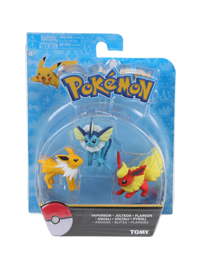 Trio of small figures from Pokemon featuring Vaporeon, Jolteon & Flareon character designs.