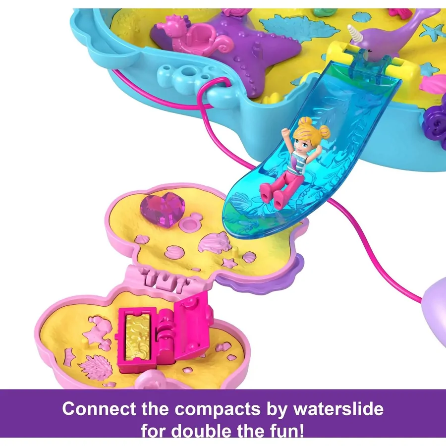 - The 2-in-1 playset doubles the fun with 2 micro dolls, Polly and Shani, and 2 beach scenes. Just open the compacts and connect them by waterslide for the ultimate ocean adventure!