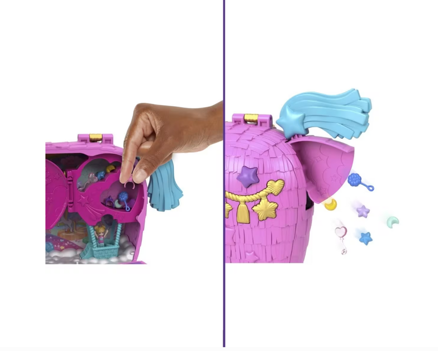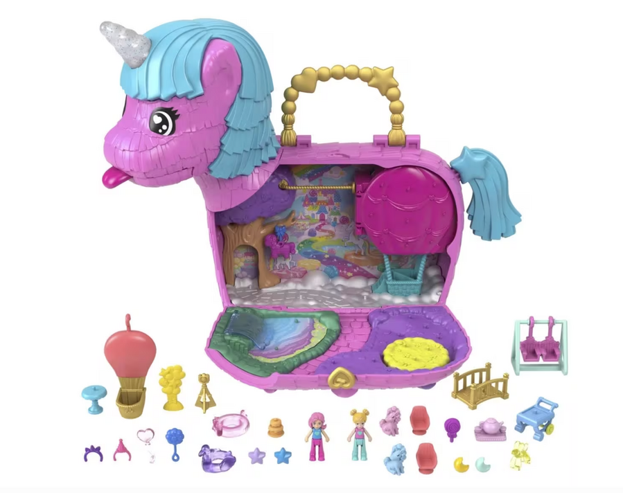 - Celebrate Polly Pocket's 35th Anniversary with the Unicorn Partyland Playset. Get the celebration started with two micro dolls and 25+ accessories, including unicorn pets. This party is poppin', or should we say poopin'! With two unique ways to discover accessories, kids will love the rainbow 'puke' packed bags that fall out of the unicorn mouth and the 'poop' of surprise accessories when the tail is lifted! Surprises can be reloaded for repeat fun. The festive unicorn pinata exterior opens to a magical celebration where dolls can go for a ride in a hot air balloon, take turns on the swing and share a slice of cake in the park. The party never ends with Polly Pocket and friends! Ideal for kids aged 4 years old and up, especially those who love rainbows, unicorns and surprises.