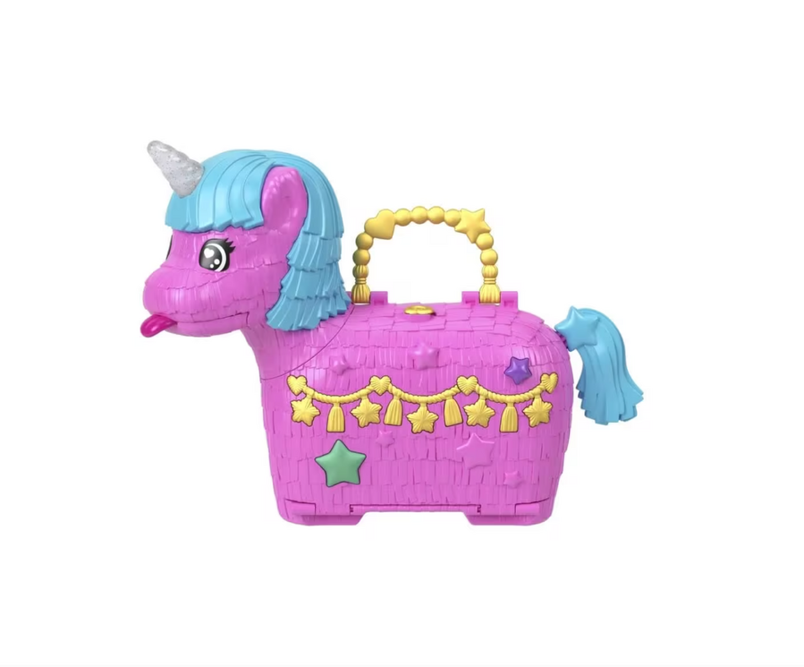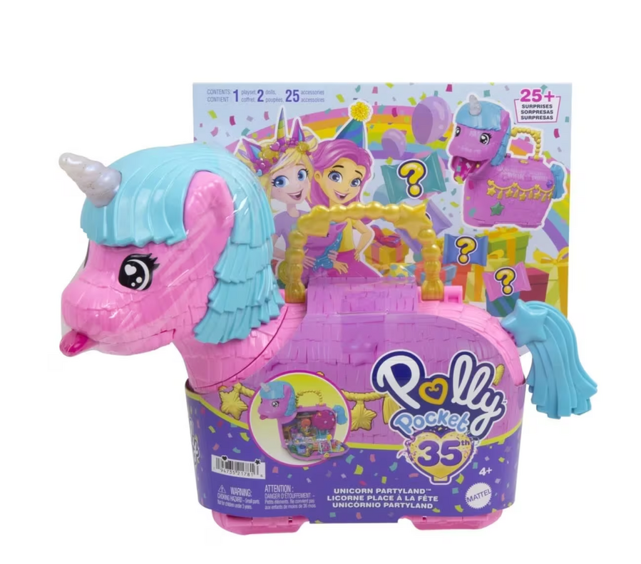 - This Polly Pocket Unicorn Partyland playset is full of festive fun! Everyone's invited to celebrate Polly's 35th anniversary with 2 micro dolls and 25 accessories, including pets