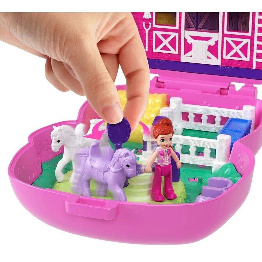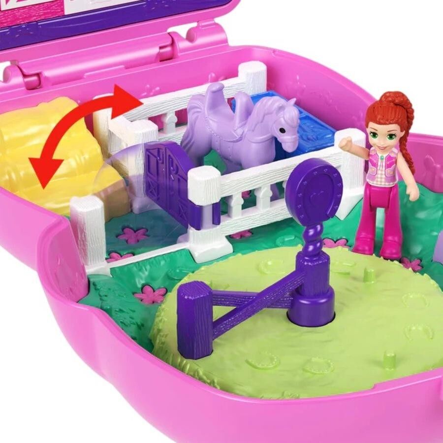 This adorable Polly Pocket Pony Rodeo Compact is shaped like a pony with a fun dress-able exterior perfect for kids who love to express their unique fashion sense! Open the playset to discover an awesome rodeo carnival interior with 1 micro doll and 10 themed accessories, including two pet horses. Lila loves to compete in the horse show, line dance behind the barn door, or slide up and down on the carnival ride. When it's time to run, pack it up for on-the-go fun! Ideal for ages four years old and up, especially those who love horses. Subject to availability. Colours and decorations may vary.