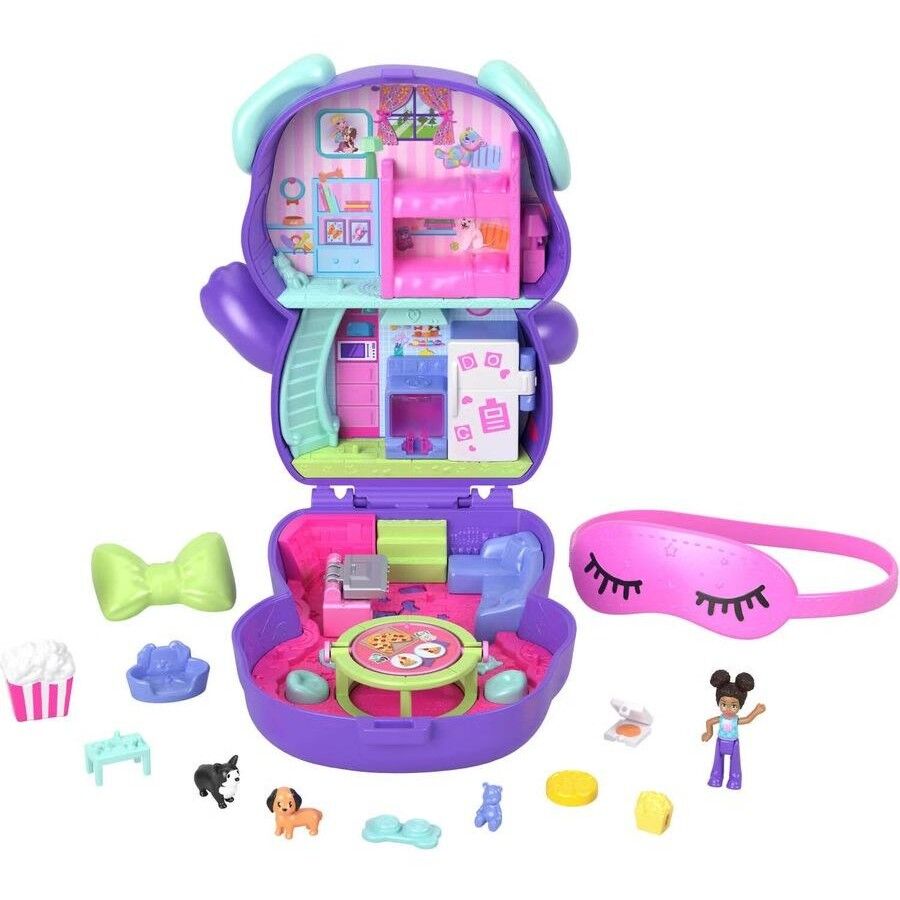 This adorable Polly Pocket Sleepover Puppy Compact is shaped like a dog with a fun dress-able exterior perfect for kids who love to express their unique fashion sense! Open the playset to discover an awesome slumber party interior with one micro doll and 10 themed accessories, including two pet puppies. Shani doll loves to share a bunk bed with pet puppy! Head downstairs to find yummy snacks in the kitchen or play video games in the living room with friends. When it's time to run, pack it up for on-the-go fun! Ideal for ages four years old and up, especially those who love sleepovers. Subject to availability. Colours and decorations may vary.