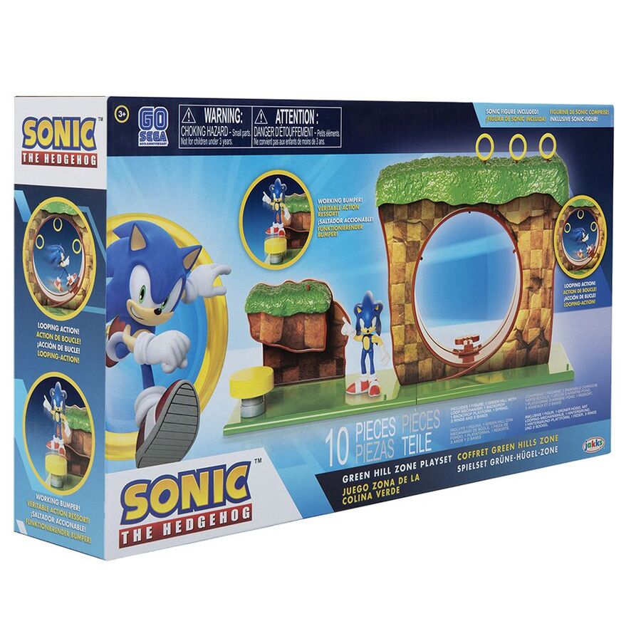 - Sonic The Hedgehog Green Hill Zone Playset with 2.5" Sonic Action Figure. Attach Sonic to peg inside loop, slide him around to run in the hill. Working spring platform. Includes 3 ring accessories. Additional pegs to display additional characters.