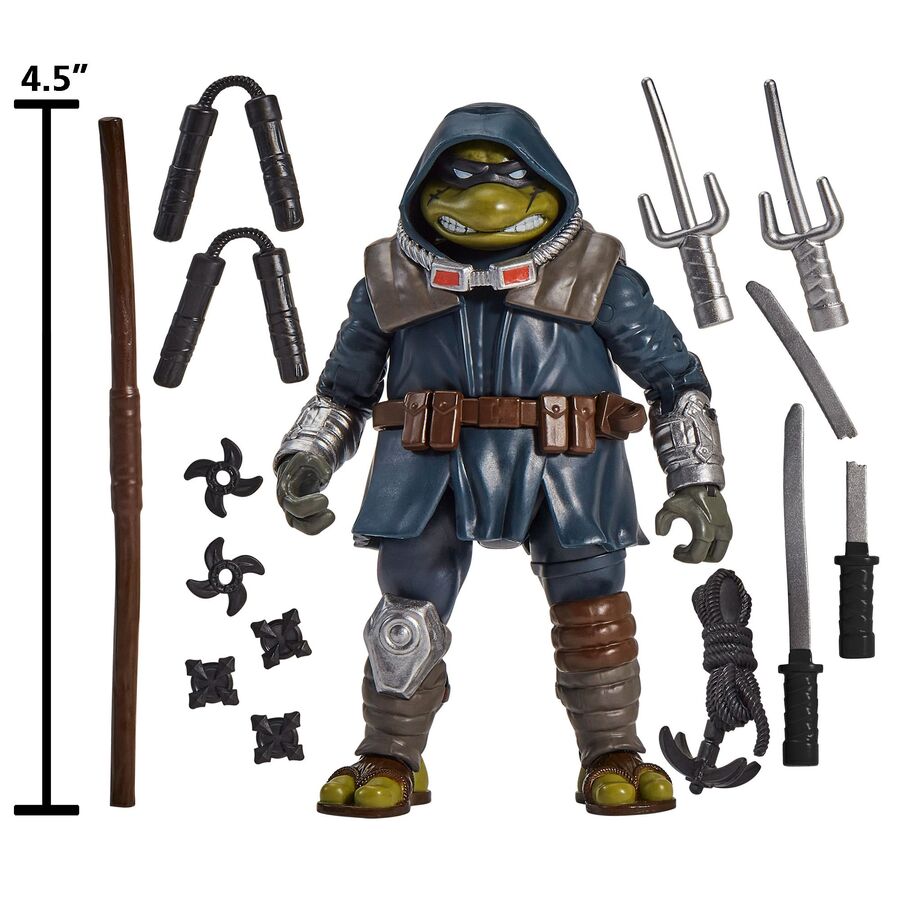 This meticulously detailed, authentically decorated, and highly poseable figure stands 4.5" tall and features 14 points of articulation to recreate your favorite scenes. Don's bo staff, Mikey's nunchaku, Raph's twin sai, and both of Leo's katanas, one with a broken blade, are included as accessories, along with a grappling hook and rope that fasten to his accessory belt.