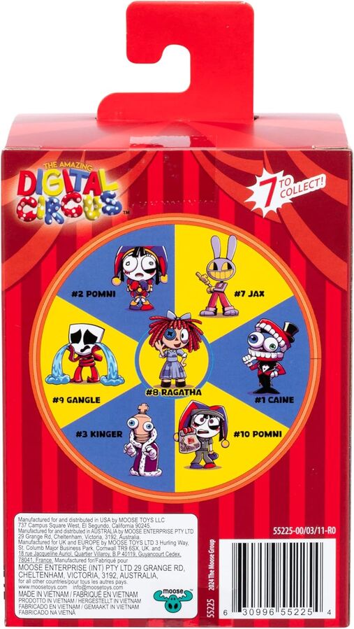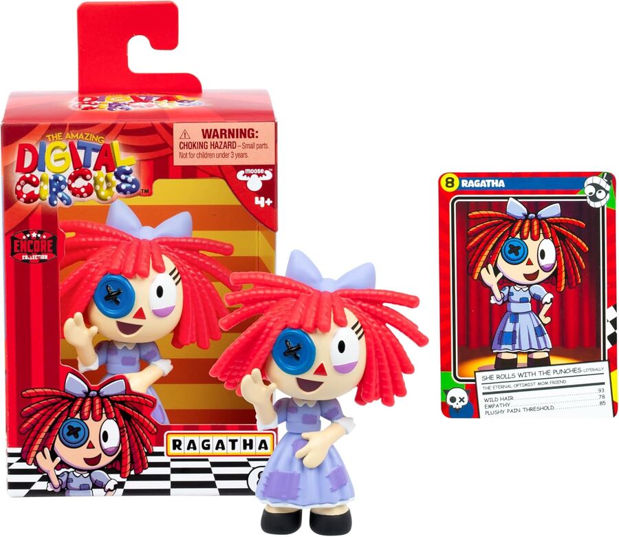 The Amazing Digital Circus is an animated series that follows a group of humans trapped within a circus-themed virtual reality game, overseen by an erratic artificial intelligence. As they embark on whimsical yet perilous adventures, they grapple with personal traumas and the looming threat of losing their sanity. Now fans of the show can collect an ensemble of digital misfits in the form of this Encore Collection of vinyl figures. This officially licensed collectible vinyl figure of Ragatha is produced by Moose Toys and Glitch Productions and packaged in a quality collector window box that adds a uniqueness to the collection. Ragatha is figure No. 8 in the Encore Collection. The 4" / 10.1 CM figure of Ragatha has been styled in one of her signature poses from the smash series that captures her unique personality and brings it to life! The Amazing Digital Circus Ragatha vinyl figure is made with premium materials and has a special "Bouncy Hair" feature adding to the figure's vivid detail. There are 7 vinyl figures to collect in the 2nd release Encore Collection, each with their own collector card inside the box. Collect Caine, Pomni, Pomni Fast Food, Kinger, Gangle, Ragatha and Jax and get ready to step into the tent!