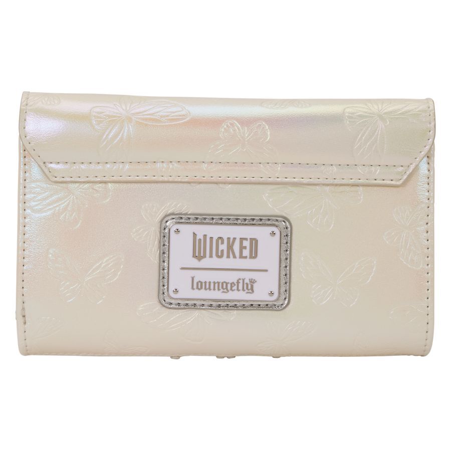 This gorgeous wallet is pearlescent with debossed butterflies and raised tonal embroidery of elegant swirls. On the front, you'll find a large butterfly with an enamel charm that has Glinda's silhouette within it! Open it up to find seven card slots and one clear ID slot. It's the perfect accessory to show off your love for all things Wicked.