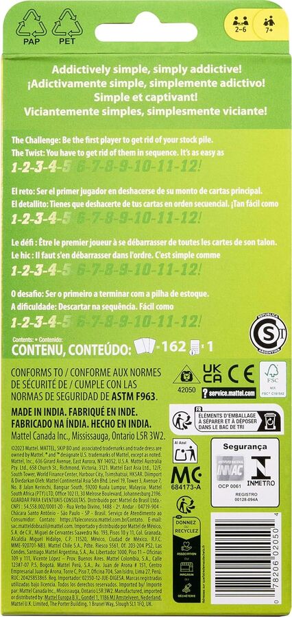 Skip-Bo is the ultimate sequencing card game from the makers of UNO! Players use skill and strategy to create stacks of sequentially numbered, ascending cards (2,3,4…) until they have no more left to play. Once everyone is dealt their own personal stockpile of cards, play begins by drawing from a central pile and building up to four “build” piles. The Skip-Bo “wild” cards break up static situations and may be played as any number. Use these cards wisely, for they can really help you beat your opponents! The first player to deplete all of his or her Skip-Bo stockpile cards is the winner! Includes 162 cards and instructions. Colours and decorations may vary.