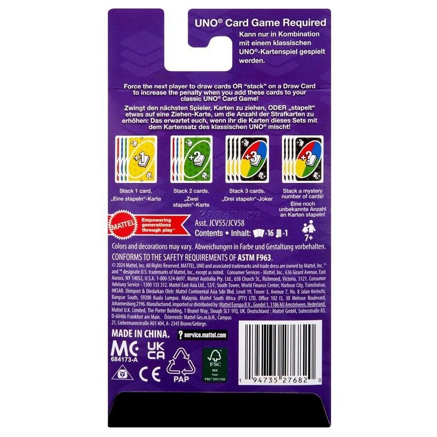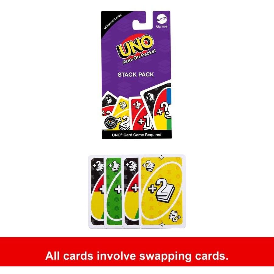 - Add these special cards to a classic UNO deck (sold separately, subject to availability) and the fun begins! Each of the 16 cards in the Stack Pack acts like a Draw Card that players can stack to make other players draw more and more cards. Play a Stack 1, Stack 2, or the dreaded Wild Stack Number card and soon players will be passing out penalties like popcorn. Makes a great gift for UNO fans and card game lovers ages 7 years old and up. Colors and decorations may vary. Ages 7 +